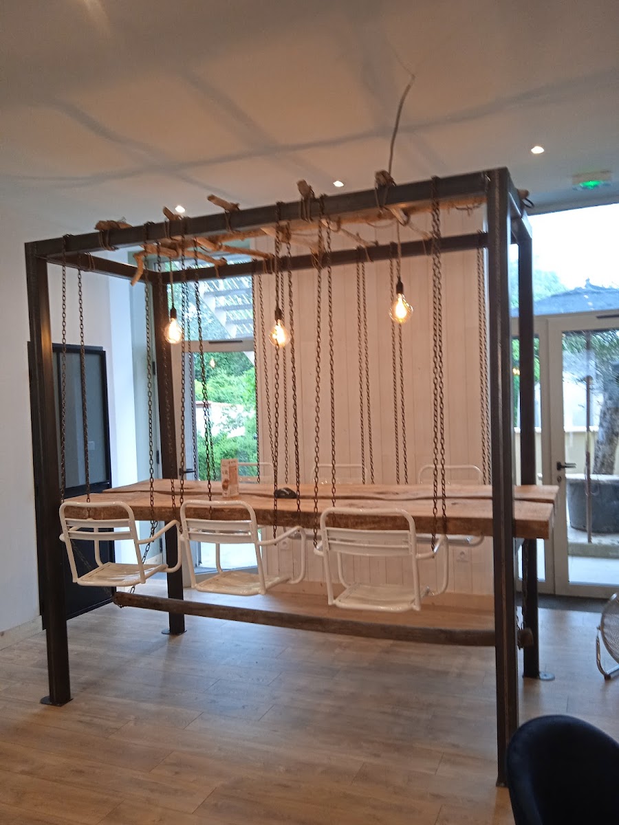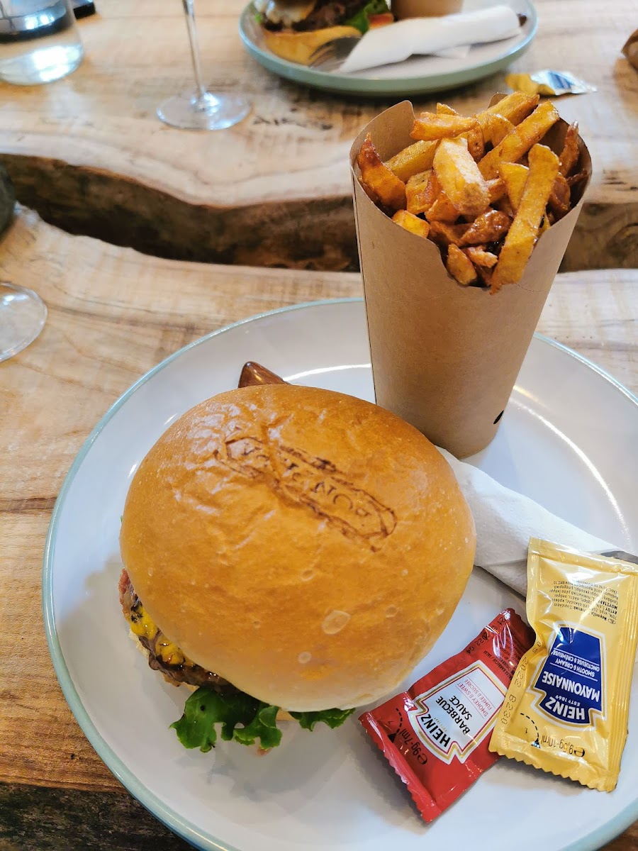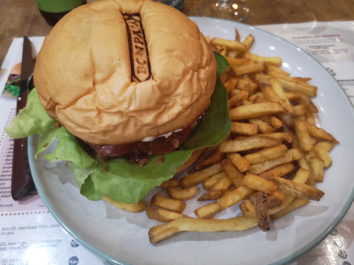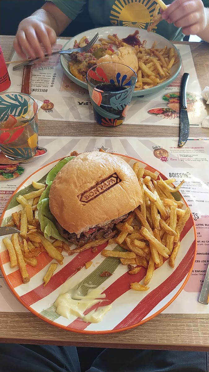 Accueil rien à redire. Déco magnifique; totalement fan de la table haute avec ses chaises balançoire. Steaks hachés, frites, sauces maison; c'était très bon. J'ai pris le burger confit de canard avec sauce moutarde-miel, je recommande ++